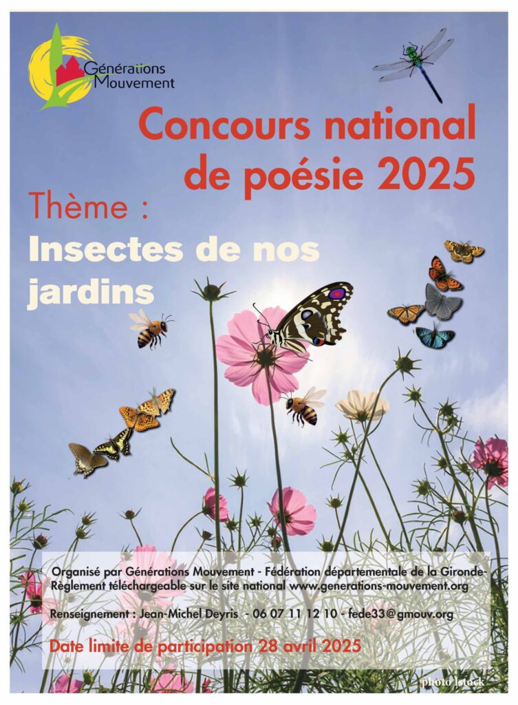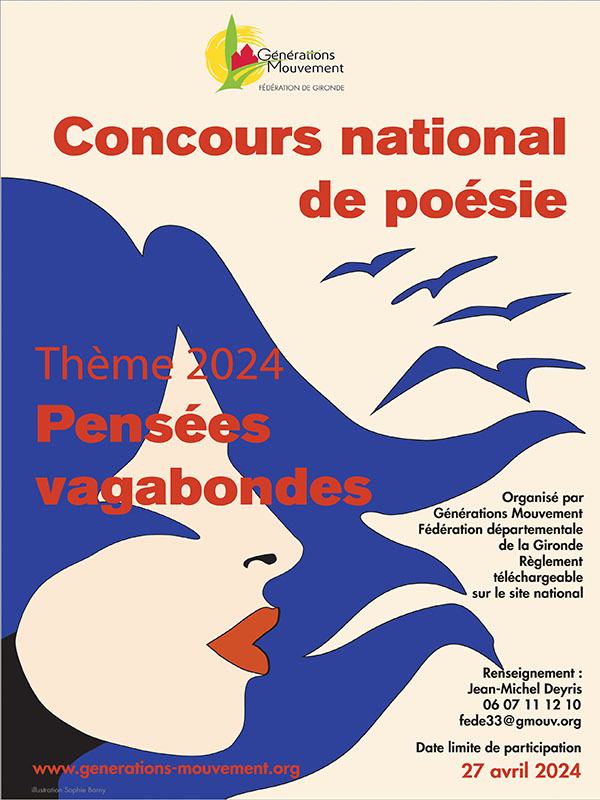 La poésie c’est l’art d’évoquer des sensations, des impressions, des émotions avec de simples mots mais pas sous n’importe quelle forme. Chaque année, la Fédération Générations Mouvement de la Gironde organise un concours de poésie accessible à tous les adhérents de notre Mouvement. Le thème de cette année était « Pensées Vagabondes. »