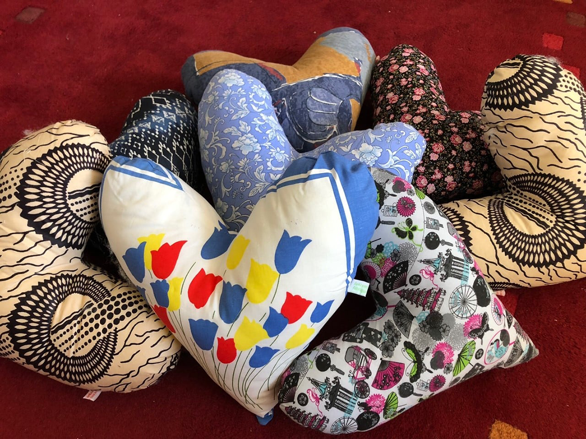 Parmi ces créations, on trouve des coussins-cœurs, spécifiquement conçus pour offrir un confort optimal après des interventions sur le sein, notamment lors de l’ablation du ganglion sentinelle. Ces coussins permettent aux patients de baisser le bras en évitant le contact avec les zones douloureuses.