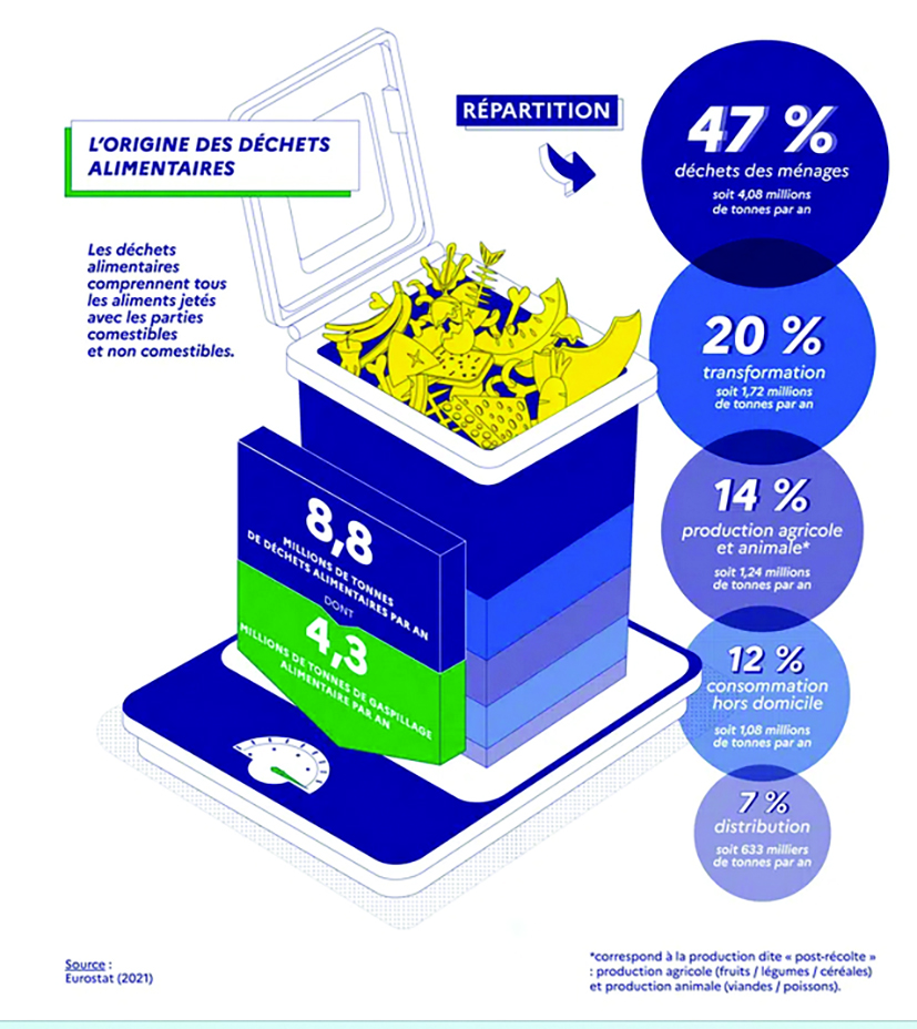 Nous jetons beaucoup de nourriture, que ce soit parce que nous les avons oubliés dans le réfrigérateur ou par excès de stockage (25 kg par an et par habitant dont 7 kg de produits emballés, l’équivalent d’un repas par semaine en moyenne !).